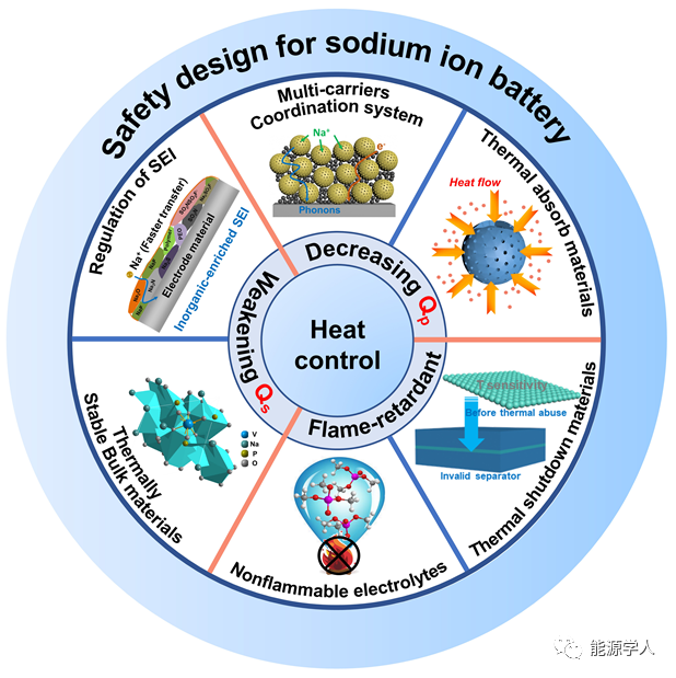 近期,武漢理工大學麥立強教授(通訊作者)和尤雅教授(通訊作者)從材料層面總結與分析了電池中主要產(chǎn)熱來源,熱失控過程引起的化學反應、衡量電池安全性的重要參數(shù),并討論了為降低熱效應電極材料的設計準則。第一作者為武漢理工大學博士研究生楊超。文章主要圍繞減少電池內部極化熱(Qp)和副反應熱(Qs)、加快熱傳遞速率、阻燃和功能性熱保護材料做了詳細探討。該文重點關注電池的熱行為,并提出一些潛在可行的策略,這將加深對SIBs熱失控的了解,并加速熱安全體系電池材料的設計。該工作發(fā)表于材料領域期刊Advanced Energy Materials,題為“Materials Design for High-Safety Sodium-Ion Battery”。