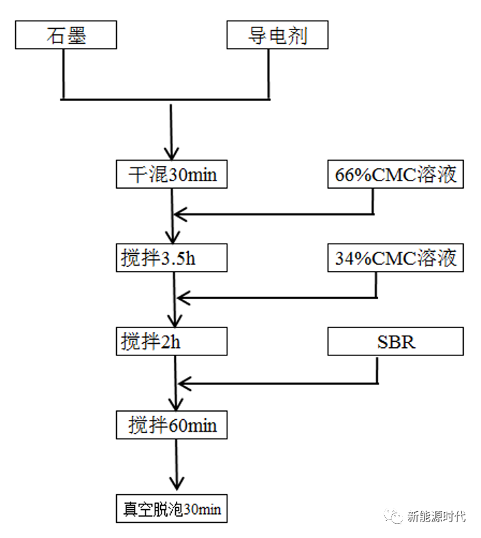 (1)干混:使粉體充分混合,固體之間的混合比在液體下固體間的混合容易多了。同時(shí)防止CMC團(tuán)聚,縮短CMC溶解時(shí)間。(2)捏合:高固含量下漿料比較硬,攪拌槳運(yùn)動(dòng)時(shí)可以對漿料進(jìn)行摩擦剪切,同時(shí)由于攪拌槳呈麻花結(jié)構(gòu),運(yùn)動(dòng)時(shí)會(huì)對漿料產(chǎn)生向下的擠壓作用。一方面可以使大顆粒破碎掉,另外使CMC包覆在石墨表面,由于CMC帶正電,包覆在石墨表面后形成雙電層結(jié)構(gòu),石墨間由于靜電排斥,可以防止石墨顆粒間團(tuán)聚。生產(chǎn)采用60~63%固含量攪拌,出于對設(shè)備損耗的考慮,由于生產(chǎn)采用200L和650L的攪拌罐,高固含量下,電機(jī)功率無法承受,因此采用低粘度攪拌。低粘度下不利于CMC的包覆,因此攪拌時(shí)間須延長。(3)第二步加CMC:CMC分子鏈基團(tuán)與水分子存在氫鍵作用,懸浮在溶液中形成龐大的空間位阻,防止?jié){料沉降。(4)攪拌分散時(shí)間:使CMC充分溶解。生產(chǎn)采用2h攪拌是利用漿料剪切變稀的原理降低漿料粘度,使?jié){料可以做到較高固含量。