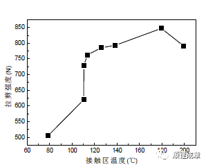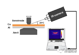 焊接工藝參數(shù)不同,導致焊機供給被焊工件的焊接總能量變化,必然引起焊接過程中的摩擦作用不同,致使焊接過程中產生的熱量變化,那么焊接過程中工件的溫度也將隨之變化,焊頭-工件接觸區(qū)溫度可以有效反映接頭強度,可以通過測量焊接過程中工件的溫度預測接頭質量。但接觸區(qū)溫度并不是越高越好,對于每種被焊材料匹配,都有一個臨界溫度值,工件溫度小于臨界溫度時,溫度越高則接頭強度越高;工件溫度大于臨界溫度時,接頭強度則會減弱。