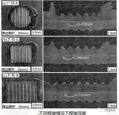 焊頭是超聲波金屬焊接的關鍵組成部分,焊接過程中,焊頭在壓力作用下要抓緊被焊工件,這樣,超聲波焊機產生的機械振動才能傳遞給被焊工件界面以形成固相連接。焊頭面積不同,會導致焊接過程中焊接壓力的分布不同,即連接界面的具有不同的應力,使焊接過程中摩擦力不同,從而使焊接過程中摩擦產熱量不同,導致焊接過程中工件溫度不同,最終影響接頭質量。而焊頭花紋齒深則決定焊頭花紋嵌入工件表面的難易程度,也直接影響工件表面壓痕深度,間接影響焊接過程中工件溫度,對接頭質量造成影響。因此,焊頭形貌及尺寸對接頭質量有非常關鍵的作用。